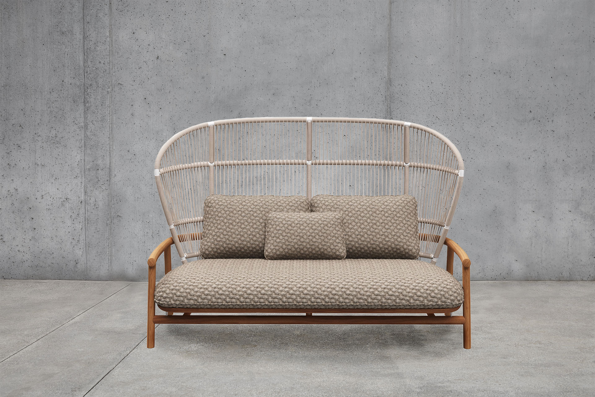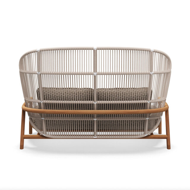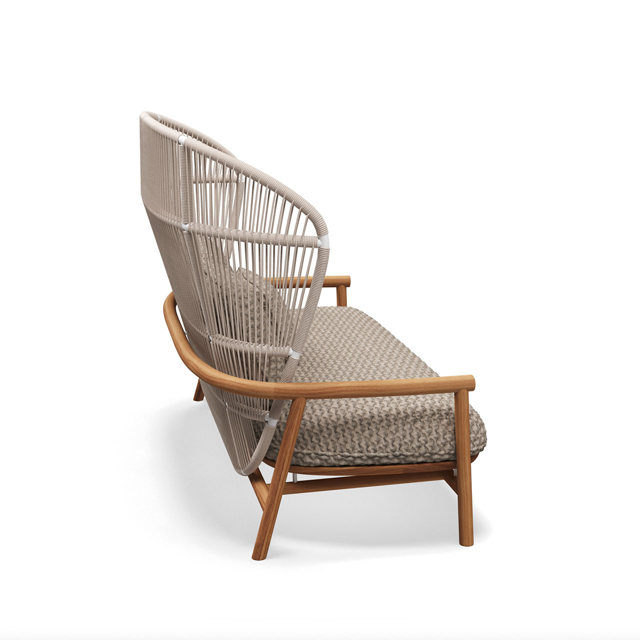 Notes: Natural finish teak base frame. Powder coated aluminium back frame. Woven outdoor rope back panel. Outdoor fabric seat & back cushions required.