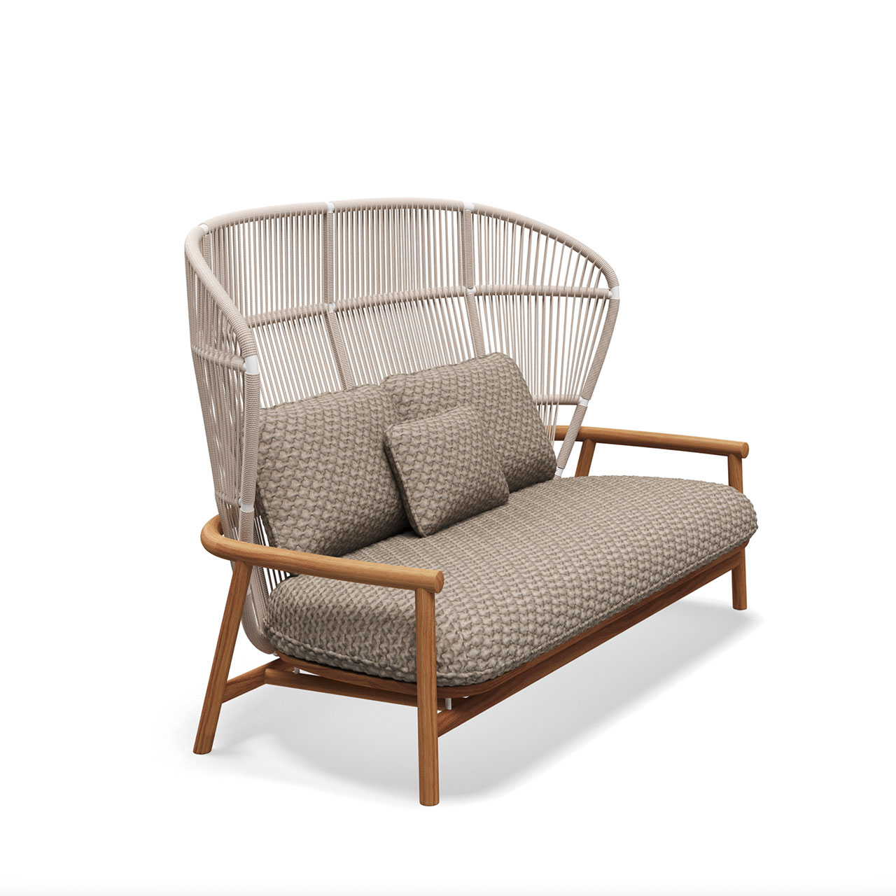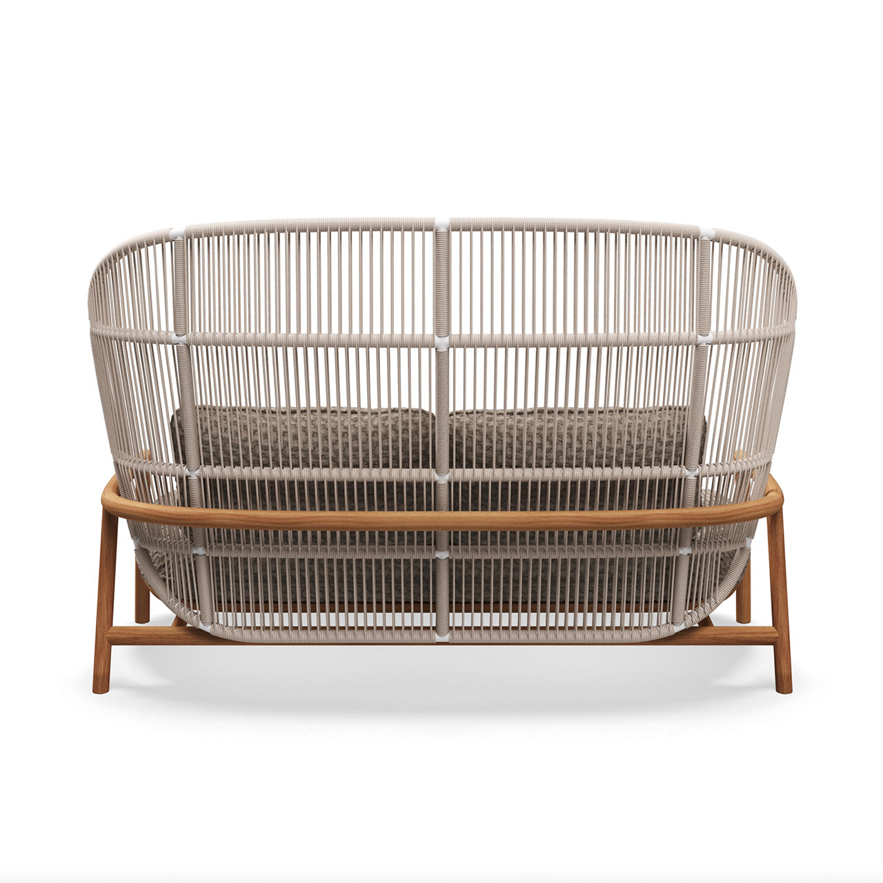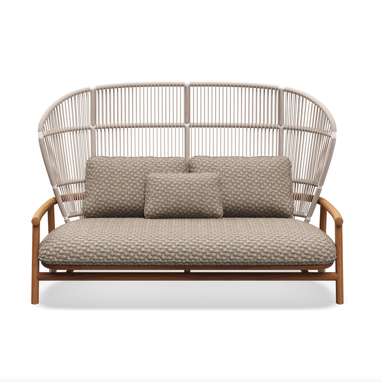 Notes: Natural finish teak base frame. Powder coated aluminium back frame. Woven outdoor rope back panel. Outdoor fabric seat & back cushions required.