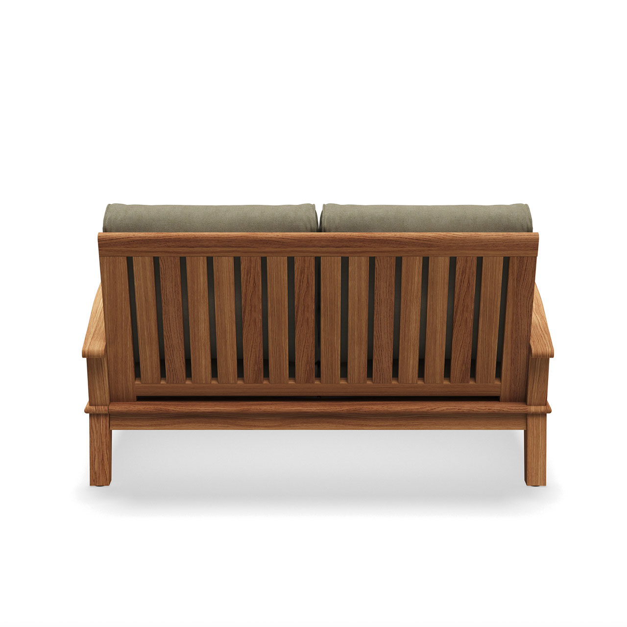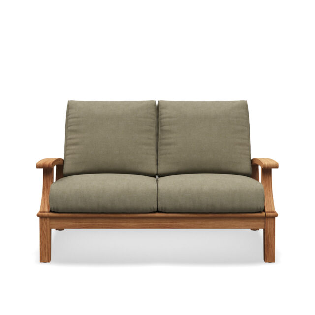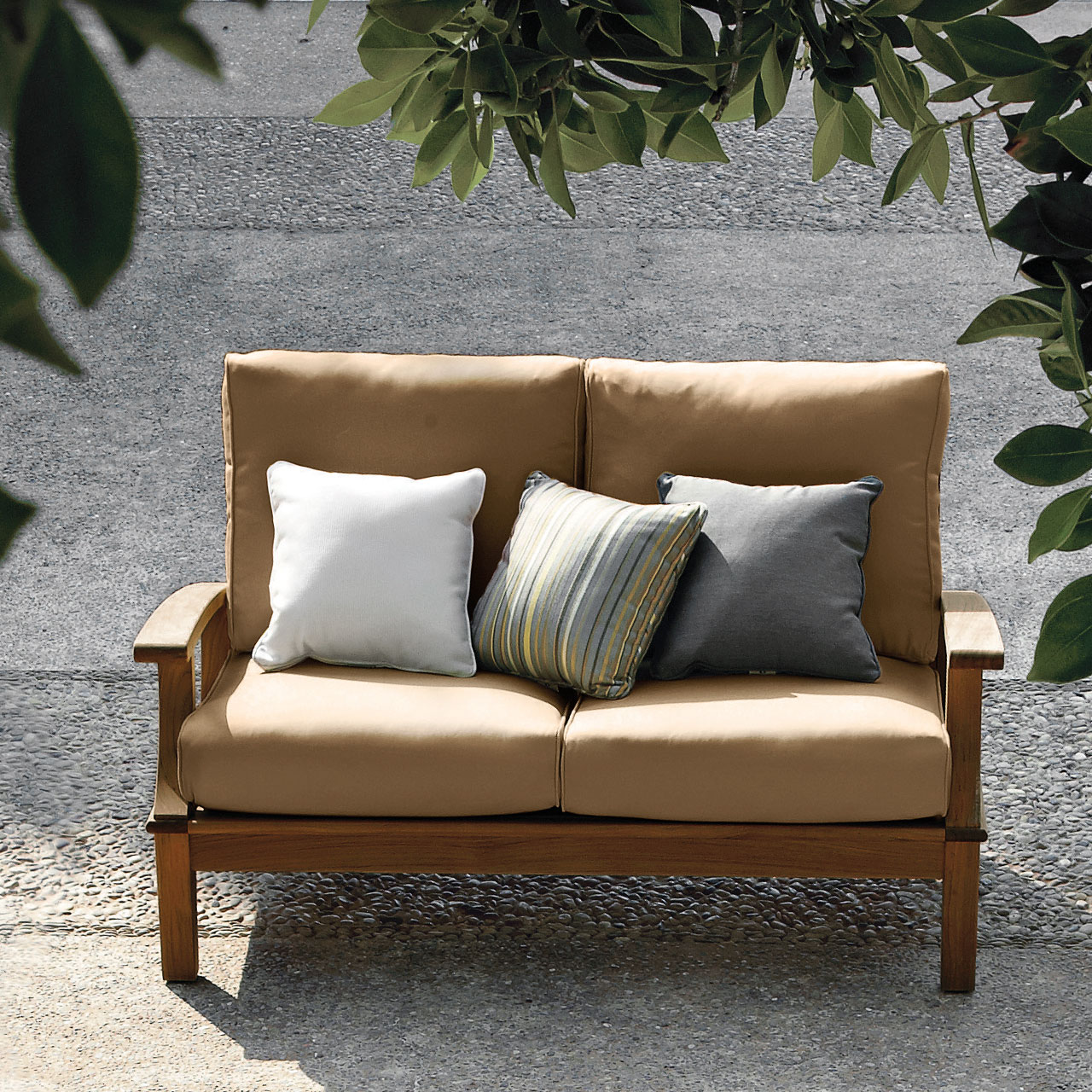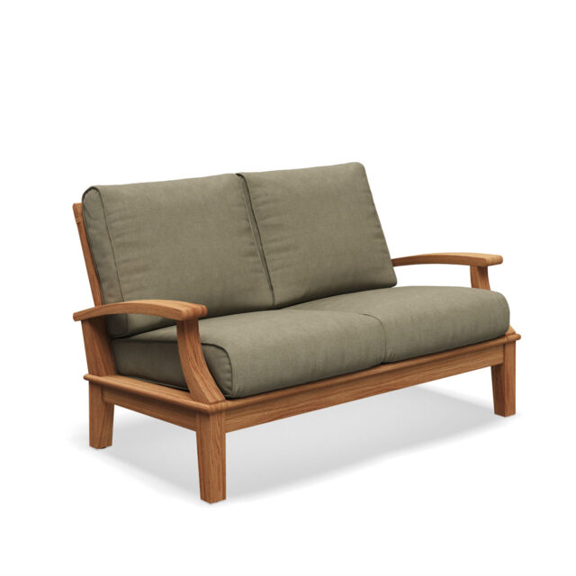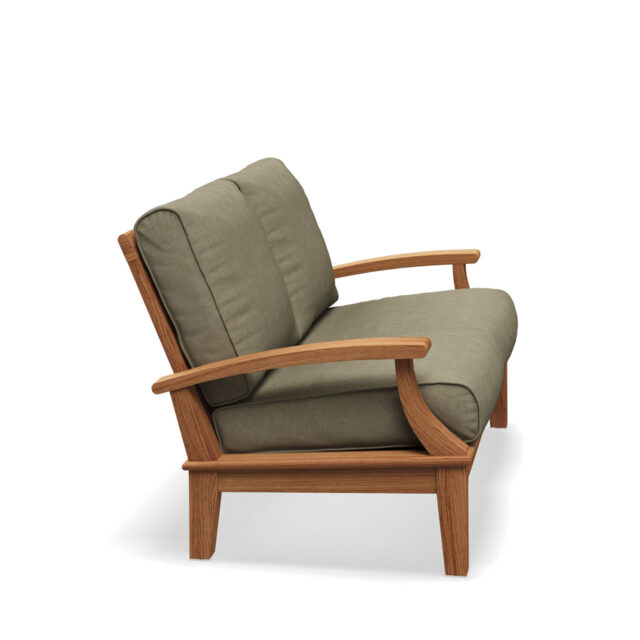 Natural finish teak frame with sling seat panel. Outdoor fabric seat & back cushions required.